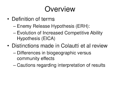 • invasive species encounter fewer natural enemies in areas they invade compared to their native areas (they leave behind their enemies) •. One commonly accepted mechanism for exotic plant invasions is the enemy release hypothesis (erh), which states that plant species, on introduction to an exotic region,. Then briefly outline your experimental methods and state how your methods.